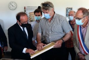 François HOLLANDE a poursuivi sa visite au rucher par une dédicace de son dernier livre, à l’issue de laquelle il s’est vu remettre un panier garni dans lequel figurait en bonne place