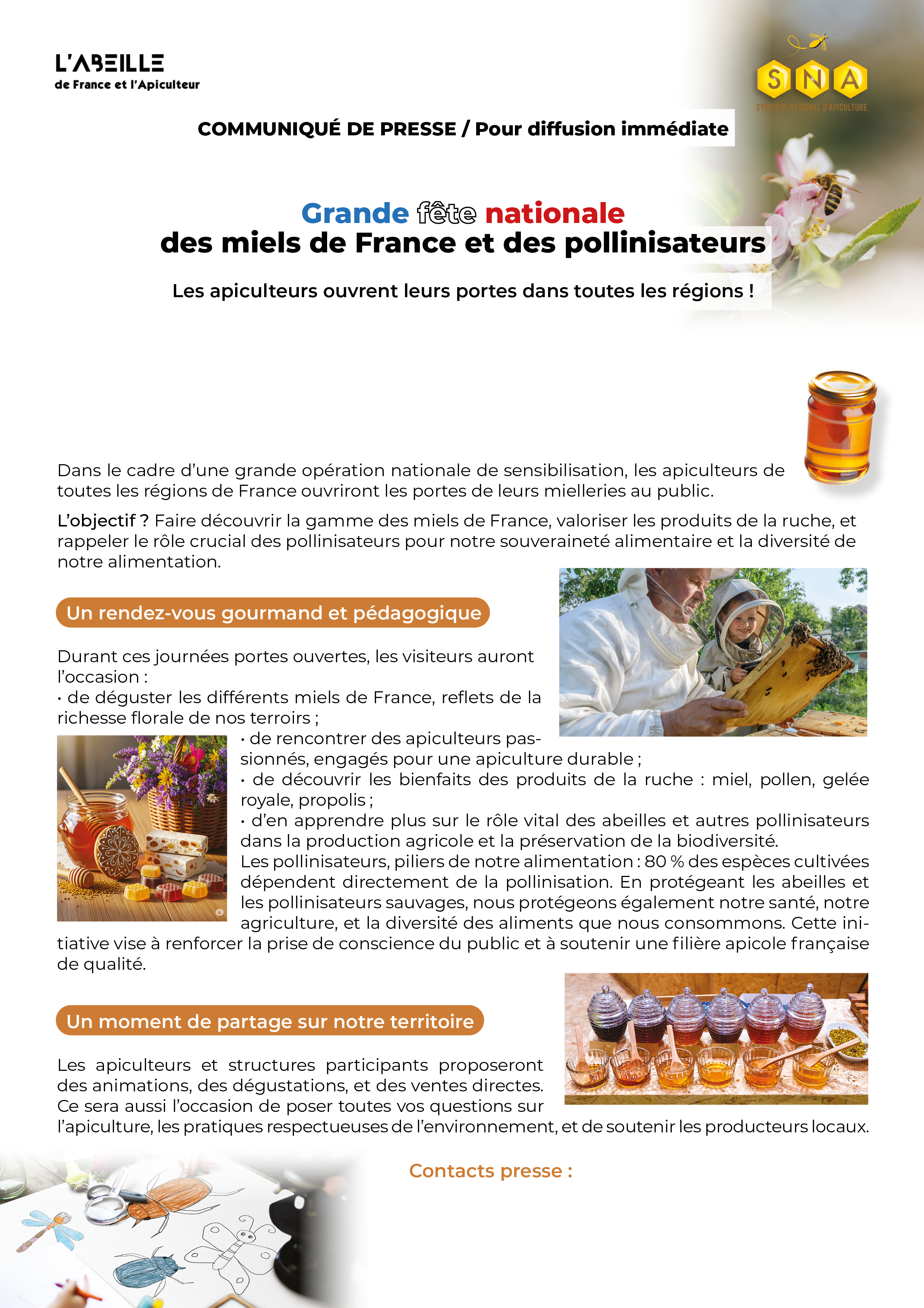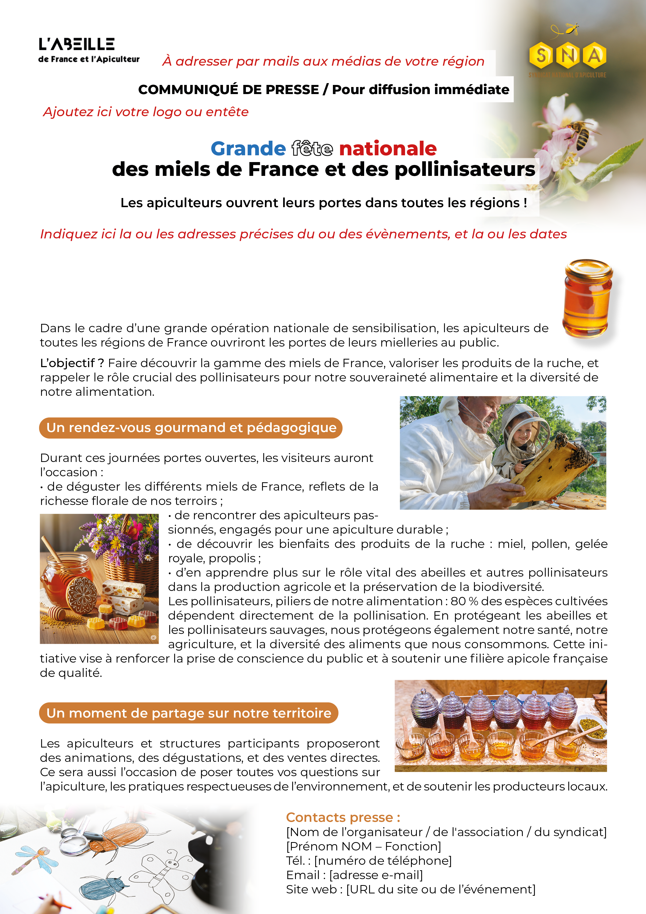 Vous trouverez ci-dessous un modèle de communiqué de presse et un modèle de flyer pour votre communication sur la Fête des miels de France.