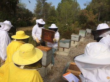 Chaque année de Janvier à Octobre nous proposons au Domaine de Fondespierre, à Castries, une formation aux stagiaires les samedi après midi, en partie en salle pour la théorie ,et sur le Rucher Ecole pour la pratique, avec une ruche et colonie dédiée à chaque stagiaire.