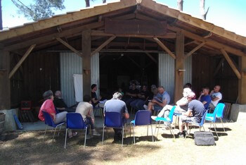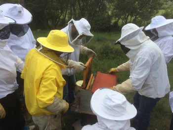 Et bien sûr , le plus important , le travail en sous groupes au rucher, avec un formateur dédié , pour effectuer toutes les tâches inhérentes à l’élevage des colonies d’abeilles ( observer l’environnement , la planche d’envol ,enfumer ,ouvrir la ruche , soulever les cadres ,observer un cadre de couvain ,chercher la reine ,transvaser une ruchette , introduire une cellule royale ,mettre une hausse …. )